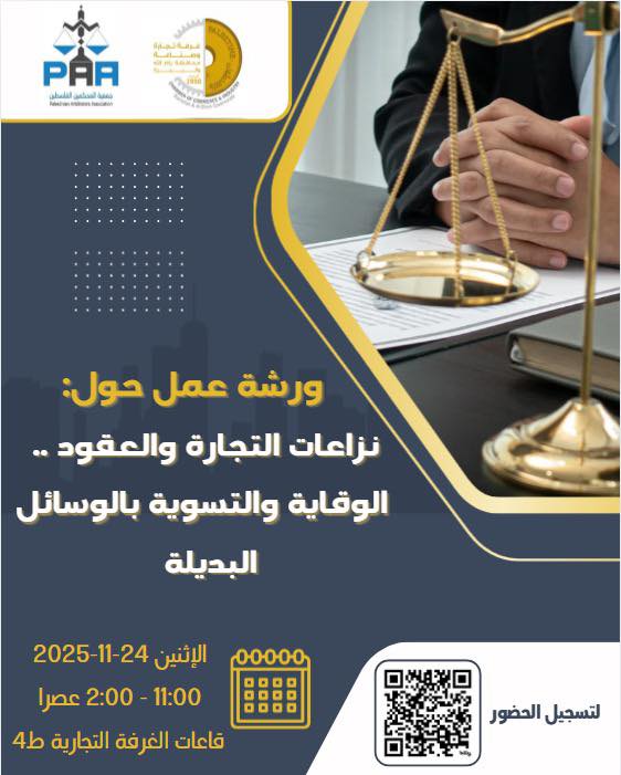 وفي إطار البرنامج المشترك بين غرفة تجارة وصناعة محافظة رام اللّٰه والبيرة وجمعيّـــة المُحَكَّمين الفلسطينيين، يسرّنا دعوتكم للمشاركة في ورشة عمل بعنوان: