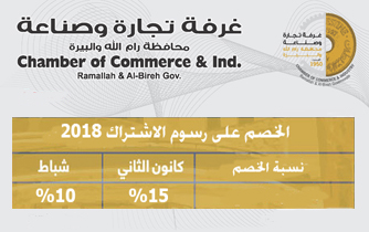 تهديكم غرفة تجارة وصناعة محافظة رام الله والبيرة تحياتها وتعلمكم بأنه تم منح خصم 15%على رسوم الاشتراك السنوي حتى نهاية شهر كانون الثاني 2018 كما أنه سيتم منح خصم 10% من بداية شهر شباط حتى آخره