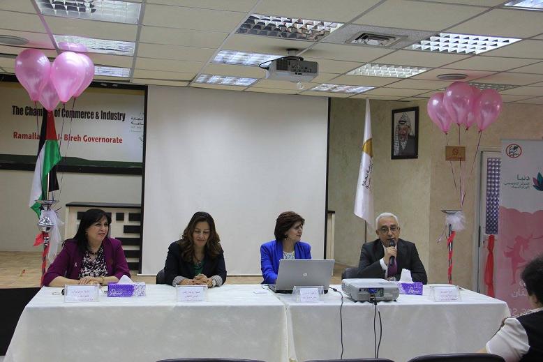 من جهتها اكدت السيدة ايمان وادي عضو مجلس ادارة غرفة تجارة وصناعة محافظة رام الله والبيرة في كلمة لها على دور الغرفة التجارية الريادي في دعم كافة المبادرات الخاصة بالنساء سواء في مجال الاعمال او في المجالات الانسانية والاجتماعية الاخرى وان الغرفة اليوم تستضيف مركز دنيا لتقدر عاليا مبادرتهم الكريمة في نشر الوعي بين السيدات حول هذا المرض الخطير وشكرت جمعية الشابات المسيحية -رام الله على حضورهم وتعاونهم مع انشطة الغرفة التوعوية