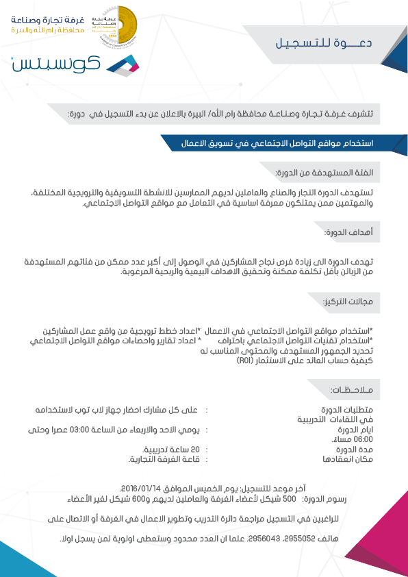 تتشرف غرفة تجارة وصناعة محافظة رام الله والبيرة بالاعلان عن بدء التسيجل في دورةاستخدام مواقع التواصل الاجتماعي اخر موعد للتسجيل الخميس الموافق 14/1/2016